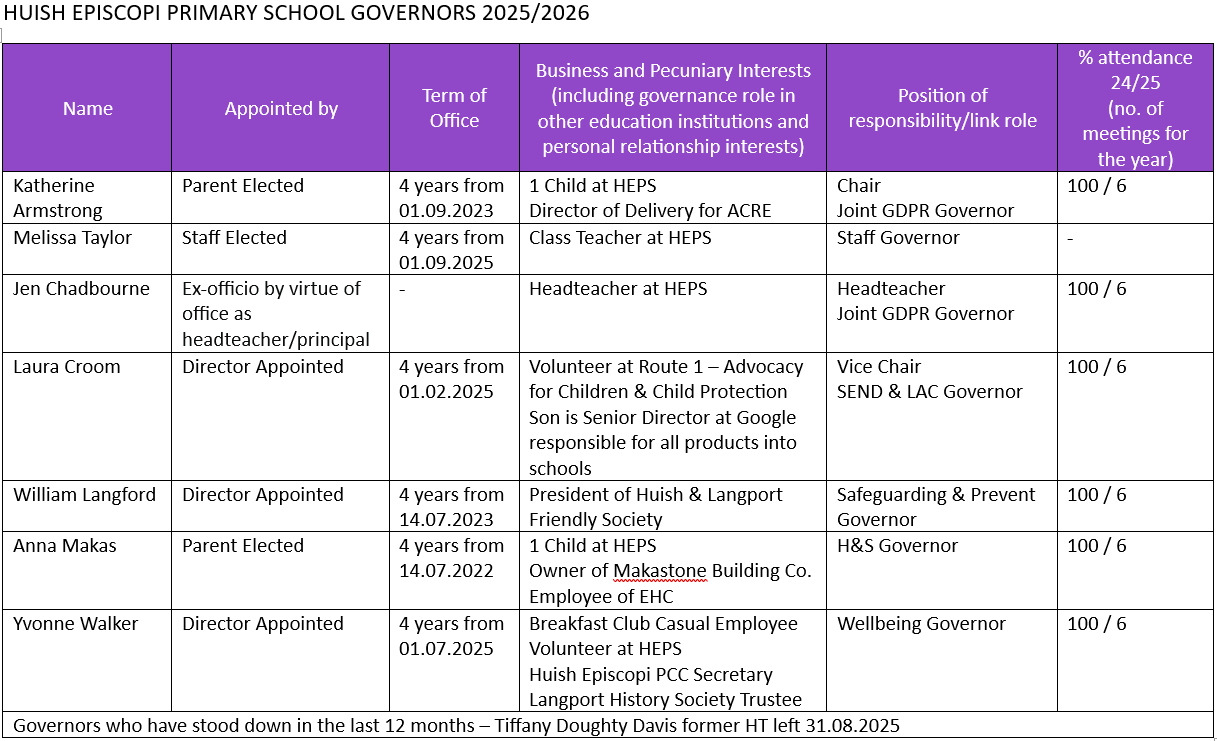 The Local Governoring Body meet at least once a term – their next meetings are on Thursday 2nd October 2025, Thursday 11th December 2025, Thursday 5th February 2026, Thursday 26th March 2026, Thursday 14th May 2026 and Wednesday 8th July 2026.
