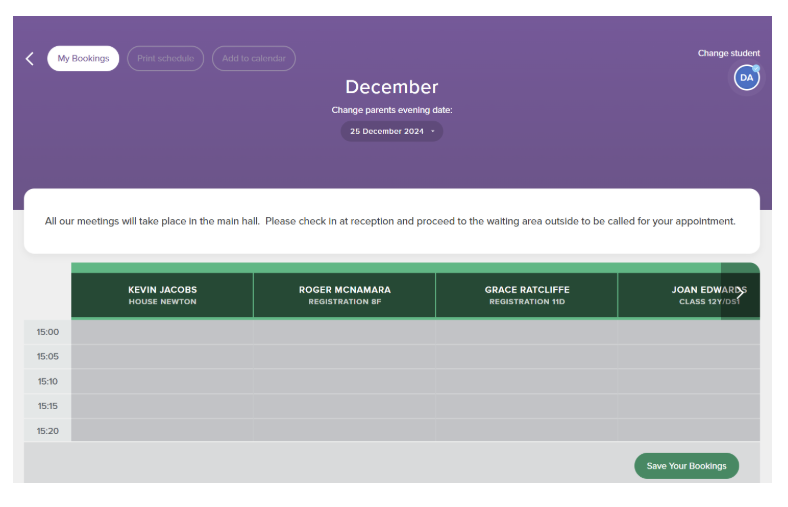 The child you are booking for will show in the top right-hand corner of the screen. If you have more than one child at our school, you will see a circle for each child. Simply click on the relevant circle to select the child you want to make a booking for.